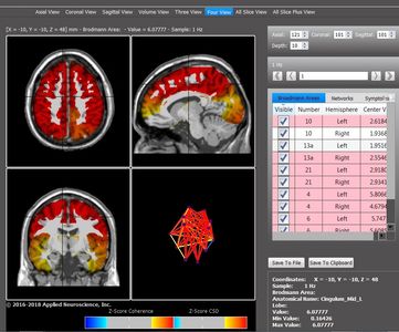 This is an EEG scan taken from a veteran suffering from severe PTS and Dyslexia, just prior to a neutralization session. For reference, an EEG of a non-stressed individual would show very little to no color on the scan. The numbers listed in color to the right of the scans indicate abnormal areas.
